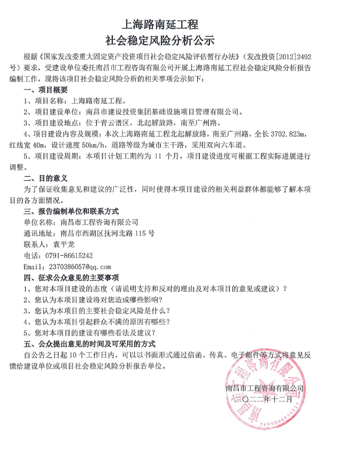 上海路南延工程社会不变风险分析公示